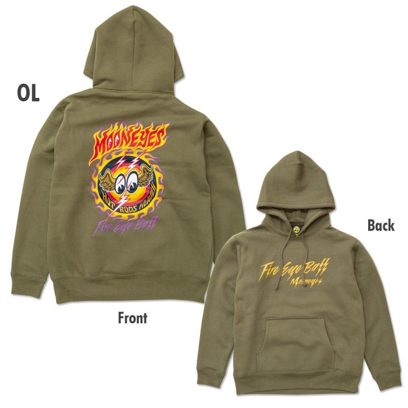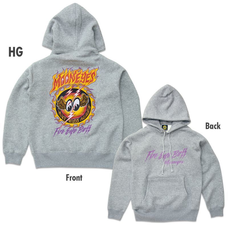 HOT RODS HEAVEN、Hot Rodder の熱いソウルがバックスタイルを大胆に飾ります。メラメラと燃える炎のような MOONEYES のレタリングや、ライトニングな Fire Eye Ball のレタリングがインパクト大!