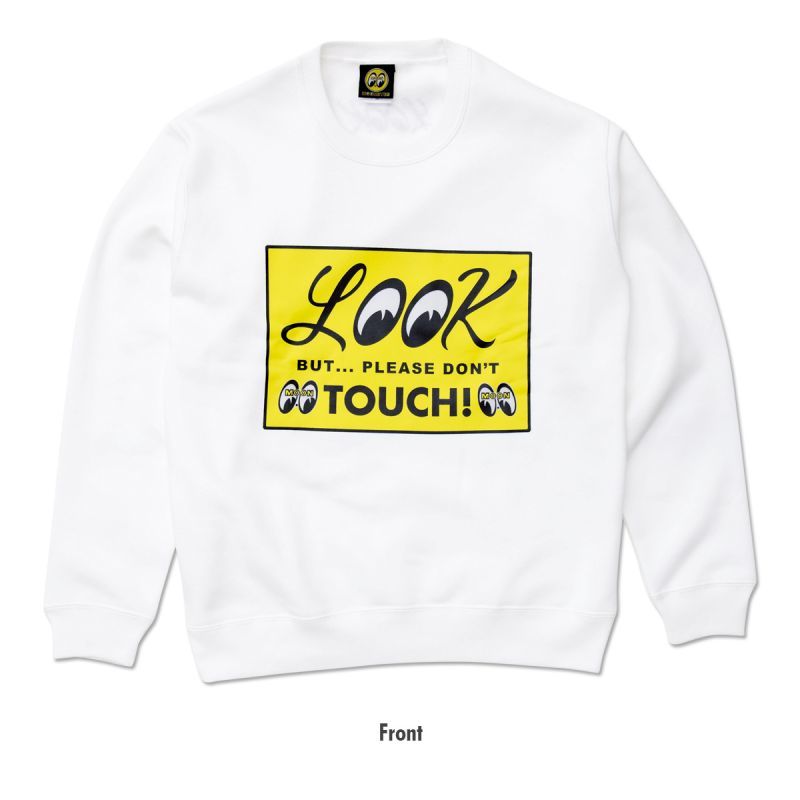 OONEYES の車やモーターサイクルと一緒に必ず書かれている LOOK BUT… PLEASE DON’T TOUCH! のメッセージサインがフロントにそのまま大胆にプリントされたスウェットです。