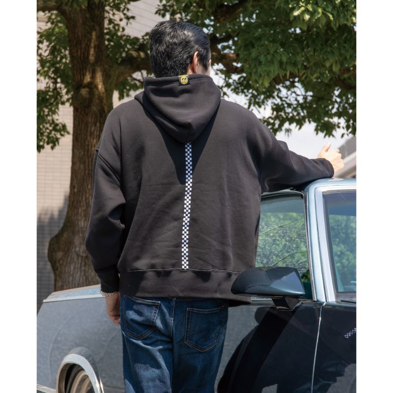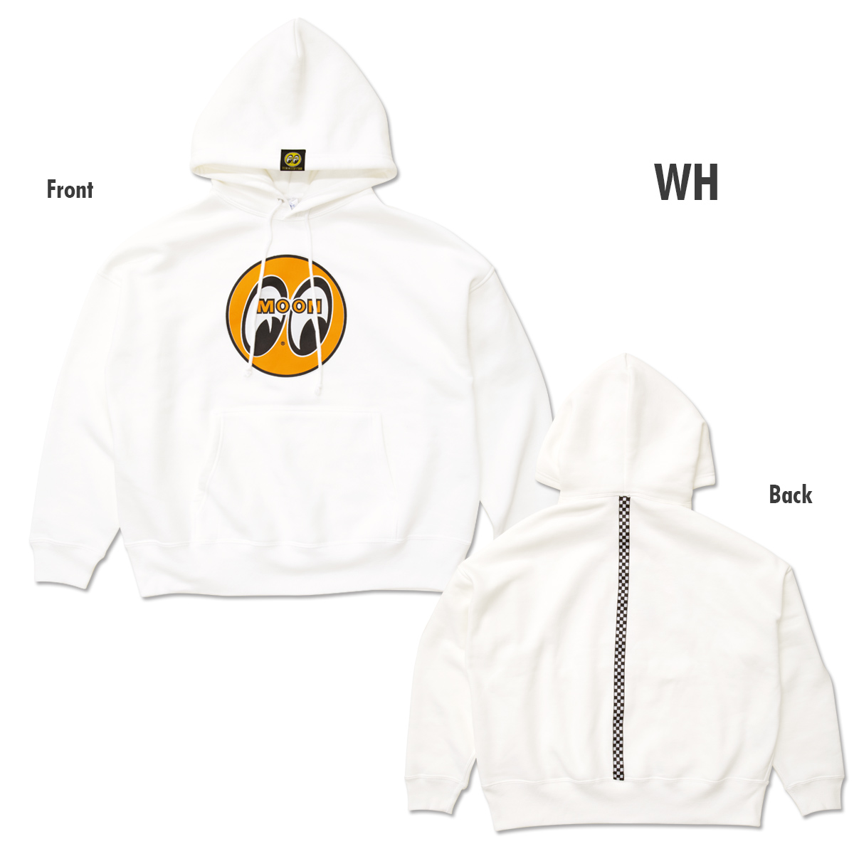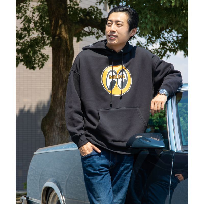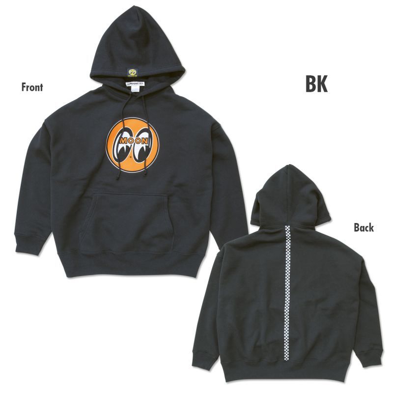定番の MOON アイボール デザインとゆとりを感じるビッグ シルエットが特徴のパーカーです。シンプルなバックスタイルのポイントにチェッカーのラインテープ、アイボール タグが付いた大きめフードはバックスタイルのアクセントになります。