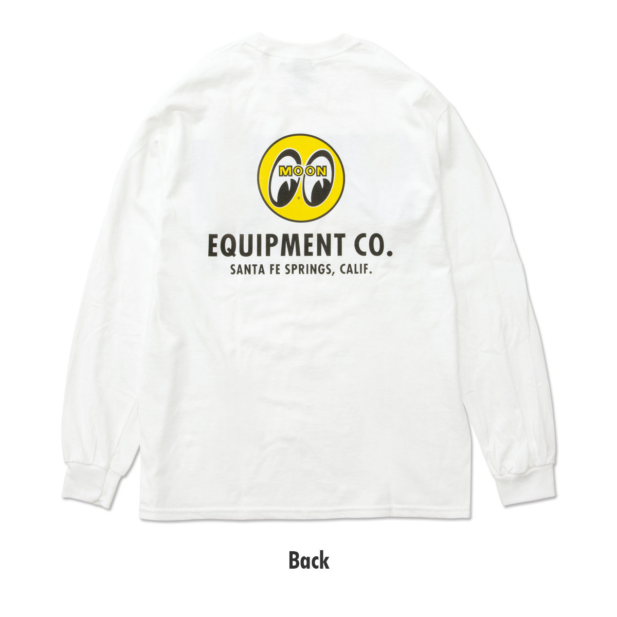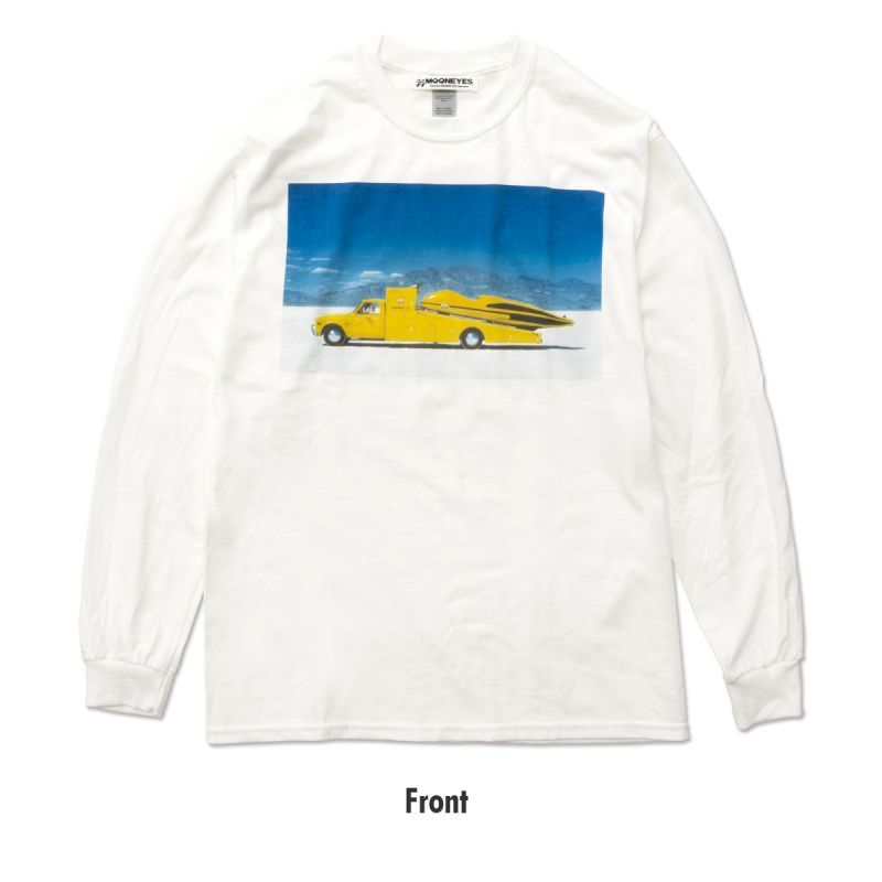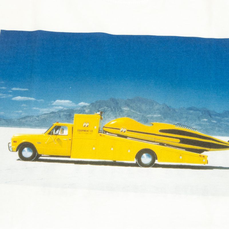 C30 Chevrolet MOONEYES Ramp Truck に載った、MQQNLINER。レースカーの華々しい歴史の1シーンがそのままフロントにプリント。そしてバックは、MOON アイボール ロゴと、EQUIPMENT CO. SANTA FE SPRINGS, CALIF. が飾ります。