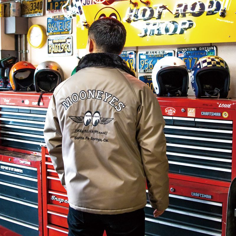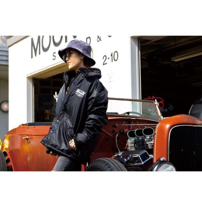 裏地に柔らかなボア素材を使用したボア コーチ ジャケットです。ネック部分にもボアが使用されていて、袖を通した瞬間から暖かさに包まれます。素材は光沢のある ポリエステル生地で、艶のある上品さ見せつつ、風を通しにくく、軽い素材で気軽に羽織れます。フロントはジップの上にバタフライ ボタンが付いた二重構造で、袖もリブ仕様なので、ライディングの際に、防風対策にも優れている本格的なアウターになります。フロントには MOON ロゴ、そしてバックには MOONEYES Fly with MOON とトラディショナルなデザインが刺繍で入ります。ボタンにも MOON ロゴが入っていて、ディテールまでこだわった MOONEYES 仕様です!