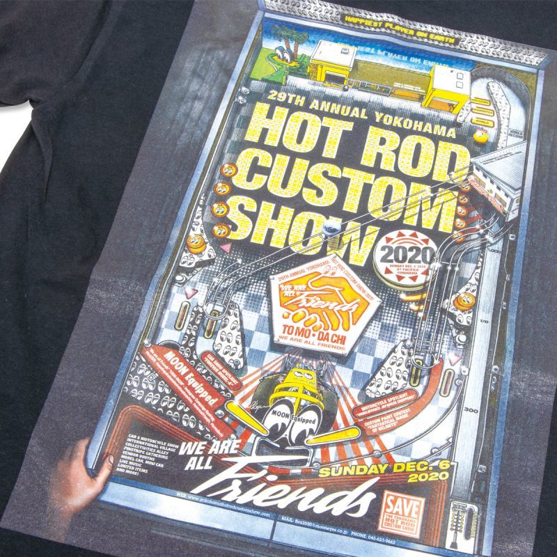 HCS2020 第一弾のポスターにも使用された MOONEYES をモチーフにしたピンボール マシーン デザインをインクジェット プリントで鮮明にフルカラーで表現。ピンボールの細部まで見ると、それぞれのマシーンパーツが MOONEYES Area-1 や MOONEYES USA の建物になっていたり、2020年のキャッチフレーズの “We are all Friends! TOMODACHI” ロゴ マークになっていたりと遊び心とストーリー性のあるグラフィックはインパクト大で見ていて飽きません!