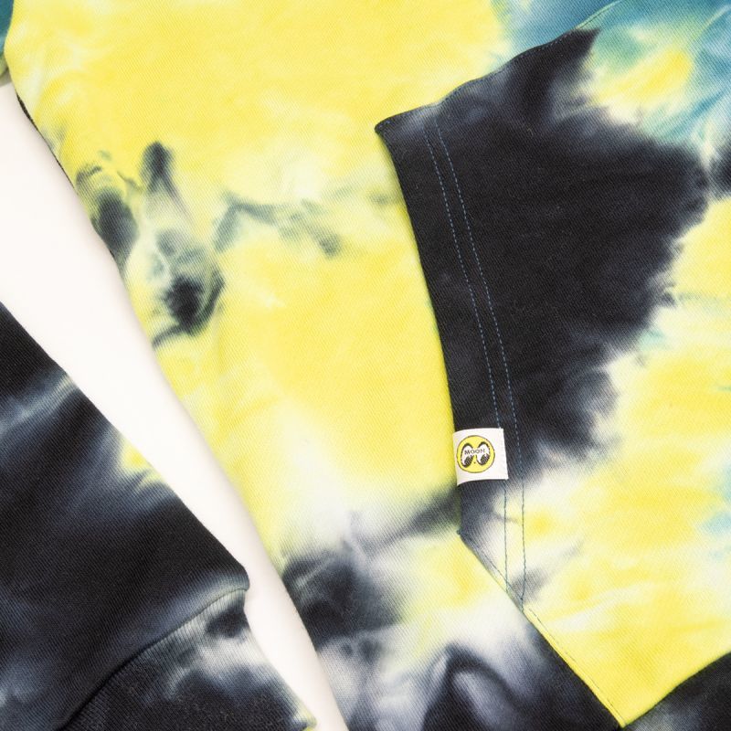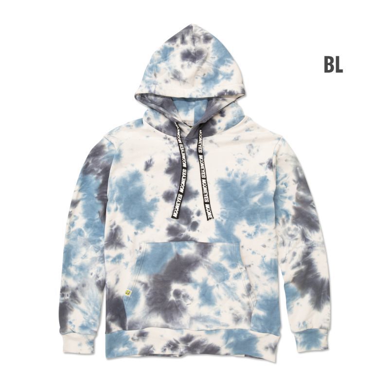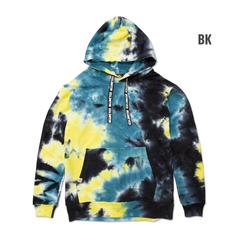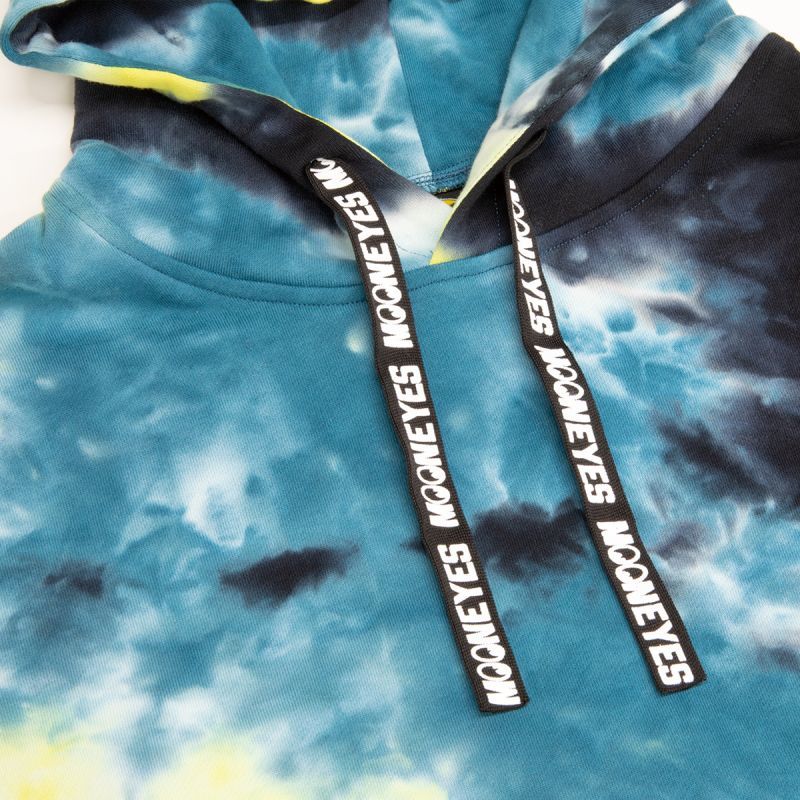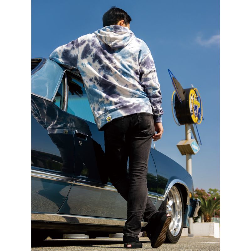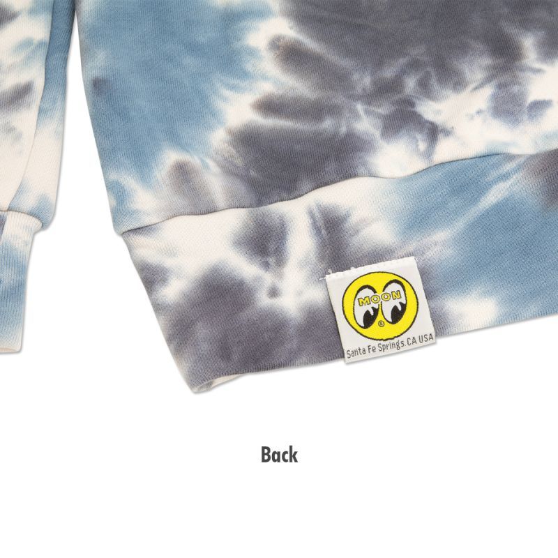 このパーカーのMOONEYES アピールポイントは、首元のリボンと、カンガルーポケット、バックの裾に付いたタグ!インパクトのあるタイダイを全面に活かしたアイテムです。