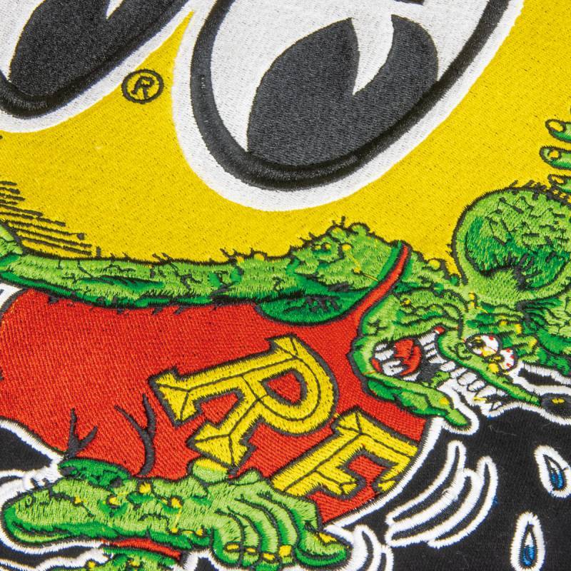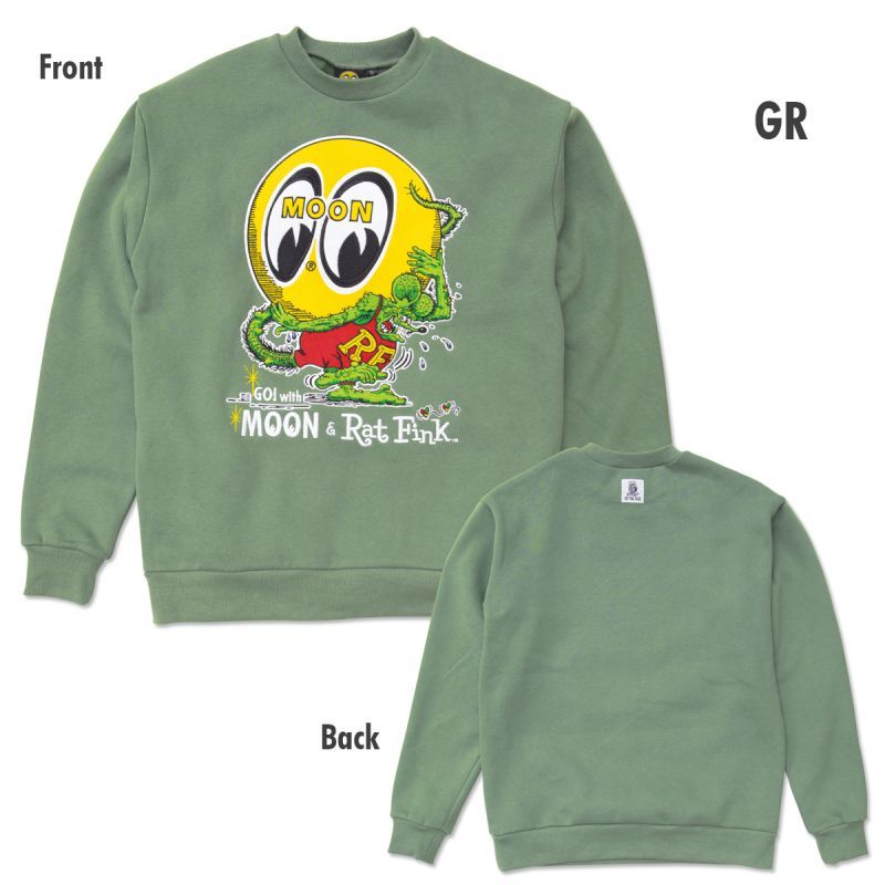 Rat Fink x MOONEYES コラボレーションで、人気の高かったデザインがスウェットになって登場!! MOONEYES のシンボル マークである大きな MOON アイボールを頑張って抱えている Rat Fink がインパクト大なデザインです。そして、このデザインがプリントではなく、全て刺繍になっているのが、一番のこだわりです。Rat Fink の血走った目や、フサフサな毛並み、細やかな表情やグラデーションなどグラフィックのディテールが、精密に再現されています!このハイクオリティーの刺繍は、ぜひ一度手にとってじっくり見ていただきたいポイントです。
