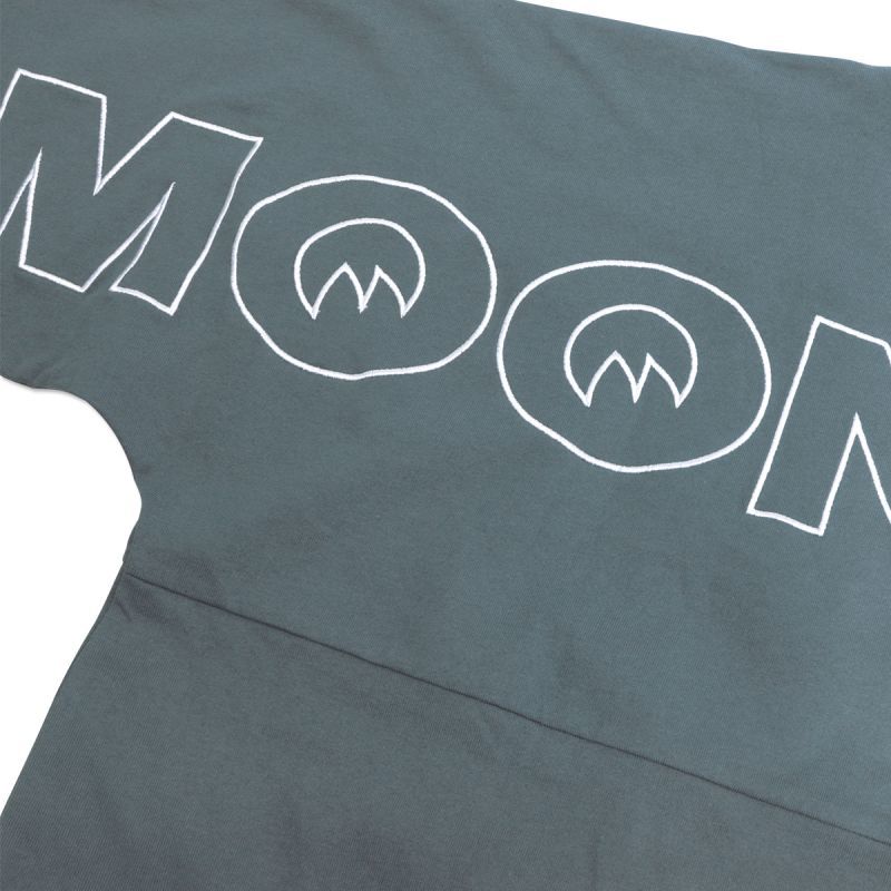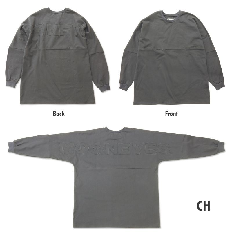 バックに大きくMOONEYESと飾られたオーバーサイズのビッグ シルエットなロング スリーブ Tシャツです。フロントにもワンポイントでさりげなく、MOONEYES ロゴとアイボール ロゴの刺繍が施されています。