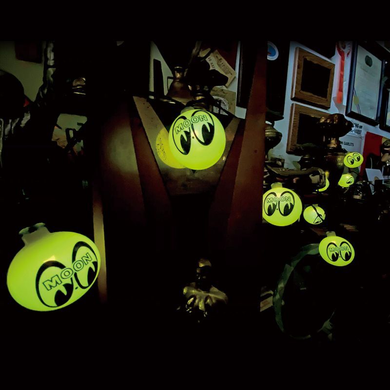 どこかに吊り下げたりはもちろん、置いておくだけでもおしゃれにインテリアを彩ってくれます。ライトのオンオフ関係なく、MOONEYES のアイボールがキュートなディスプレイに!全部で 10個の MOONEYES アイボールが点灯します。