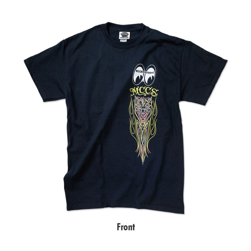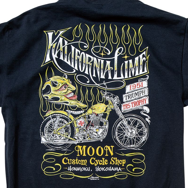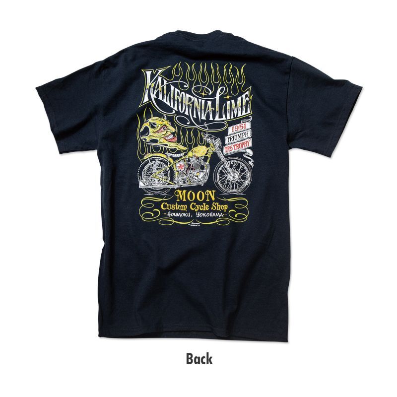 本牧 横浜 MOONEYES Area-1 でも展示されている 1951 Triumph TR5 “Kalifornia Lime” がバックを大胆に飾るTシャツです。さらに、モーターサイクルと一緒に大きく描かれている Devil シフトノブがモチーフとなり、エッジの効いたデザインが注目度抜群!! 随所に使われているピンストライプのテクニックにも Wildman の技が光ります。