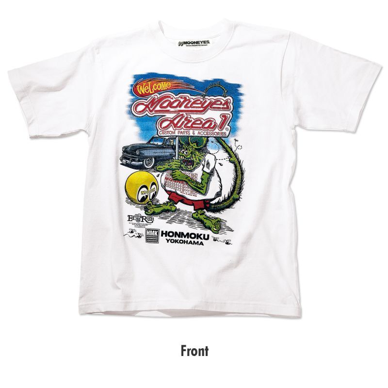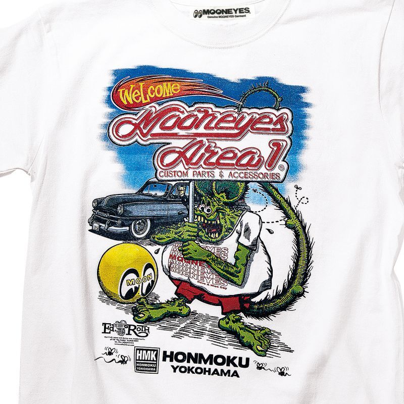 Welcome MOONEYES Area-1! 本牧 横浜 MOONEYES Area-1 を Rat Fink がご案内!! さらに、知る人ぞ知る MOONEYES STAFF が愛車が、Rat Fink の後ろに……。まるでトイ パッケージのような遊び心のあるデザインで、性別年齢問わず楽しんで頂けるような Tシャツです。