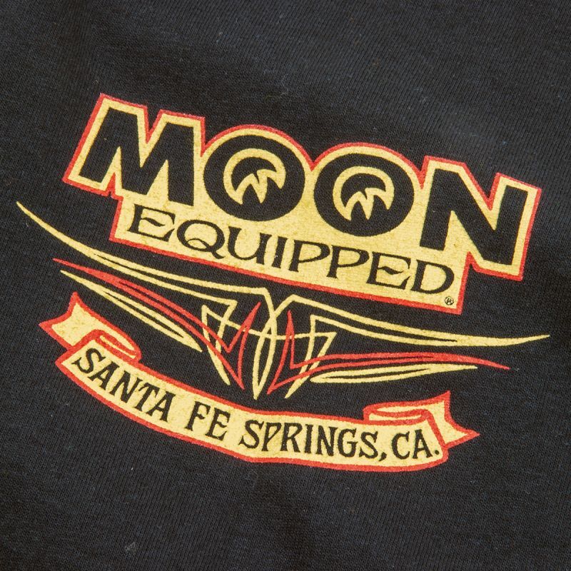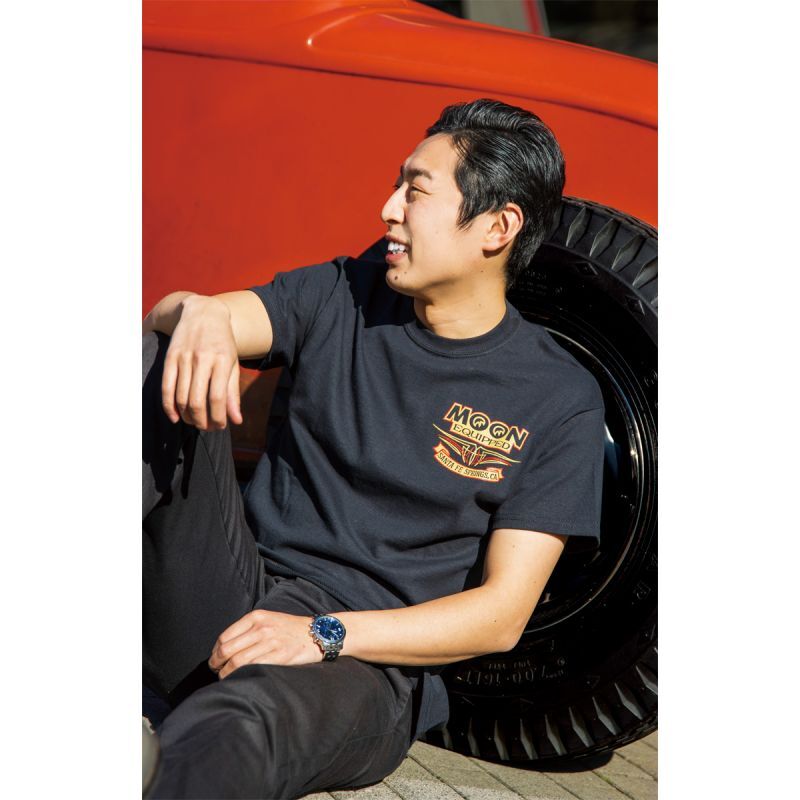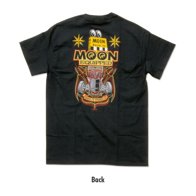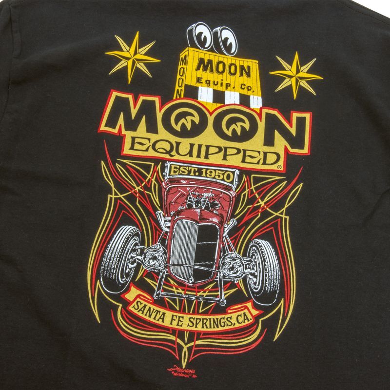 MOONEYES で定番人気の HOT ROD がバックを飾るブラックの Tシャツです。HOT RODDER に愛されている 1932 ロードスター Tシャツ が Wildman 石井によって、描かれています。 1932 ロードスターだけではなく、MOON Equip. Co. のビルディングやロードスターを囲むようなレッドとゴールドのピンストライプに Wildman 石井のこだわりを感じられるデザイン。フロントには、胸元に MOONEYES USA のアドレスに、クラシカルな MOON EQUIPPED ロゴとピンストライプが入り、MOONEYES USA スタイルになっています!