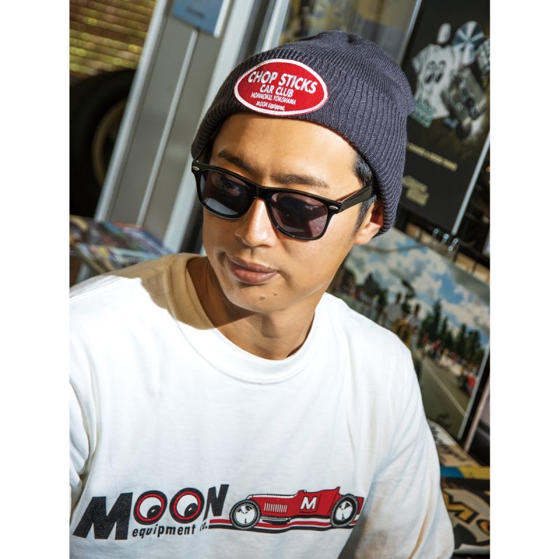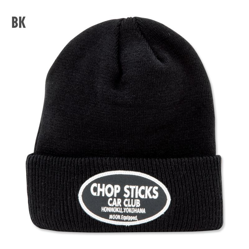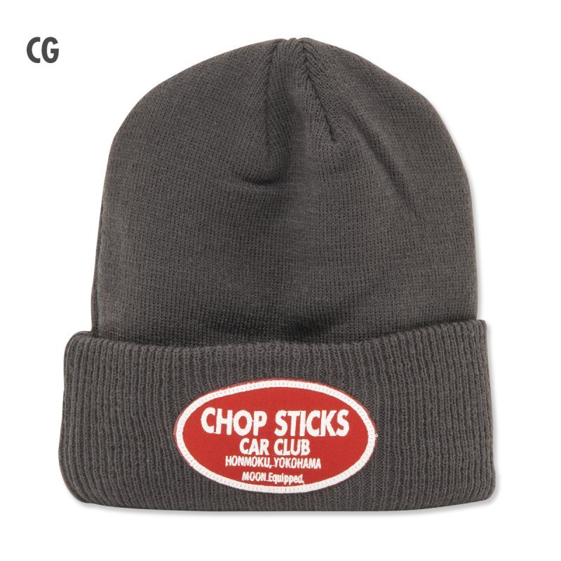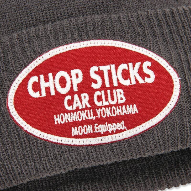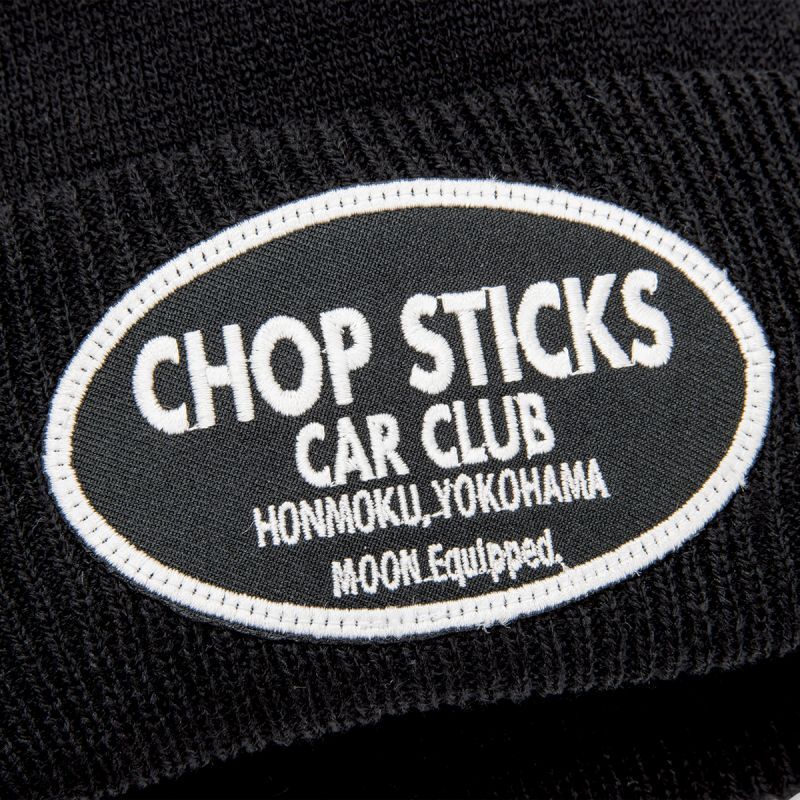 シンプルなビーニーのフロントに、オーバルの CHOP STICKS CAR CLUB ロゴパッチが入ります。