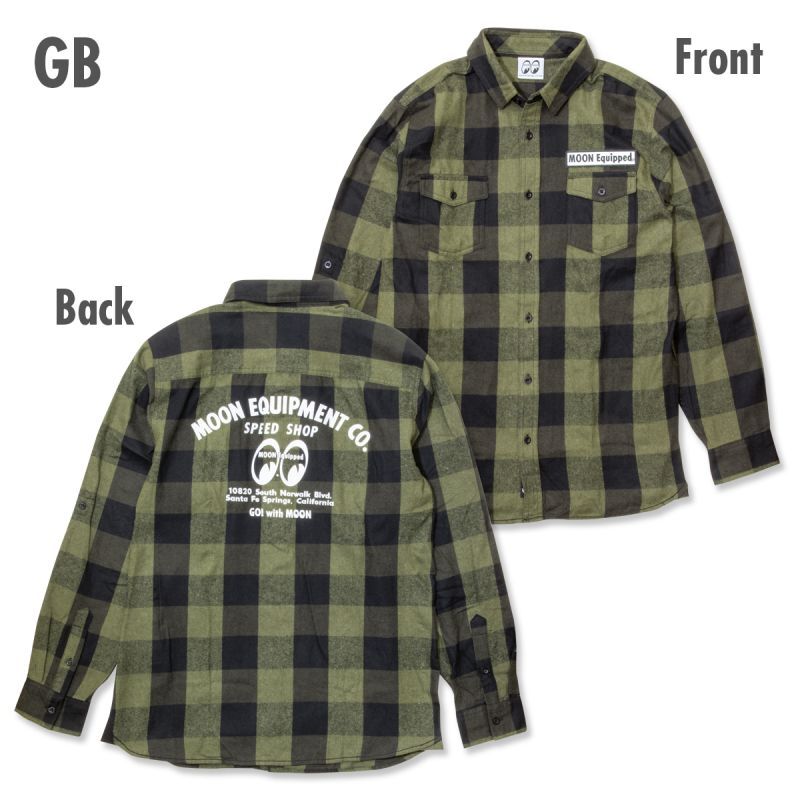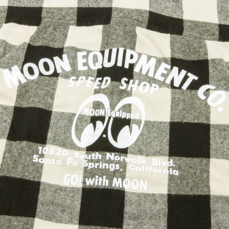 MOON SPEED SHOP デザインのフランネルシャツです。バックに “Speed Shop” のレタリングと MOON Equipped ロゴ をプリント、フロントは 左胸ポケット上に MOON Equipped ロゴ パッチがついています。