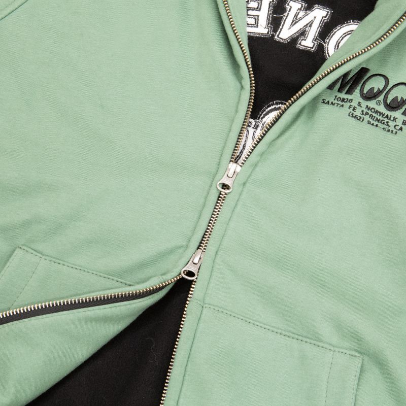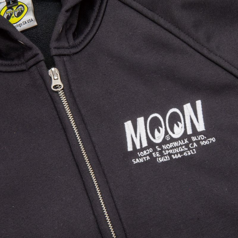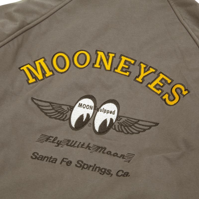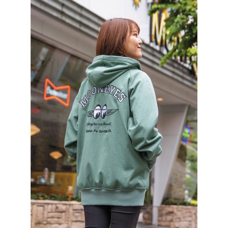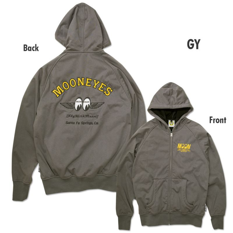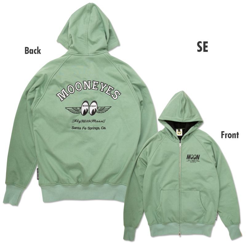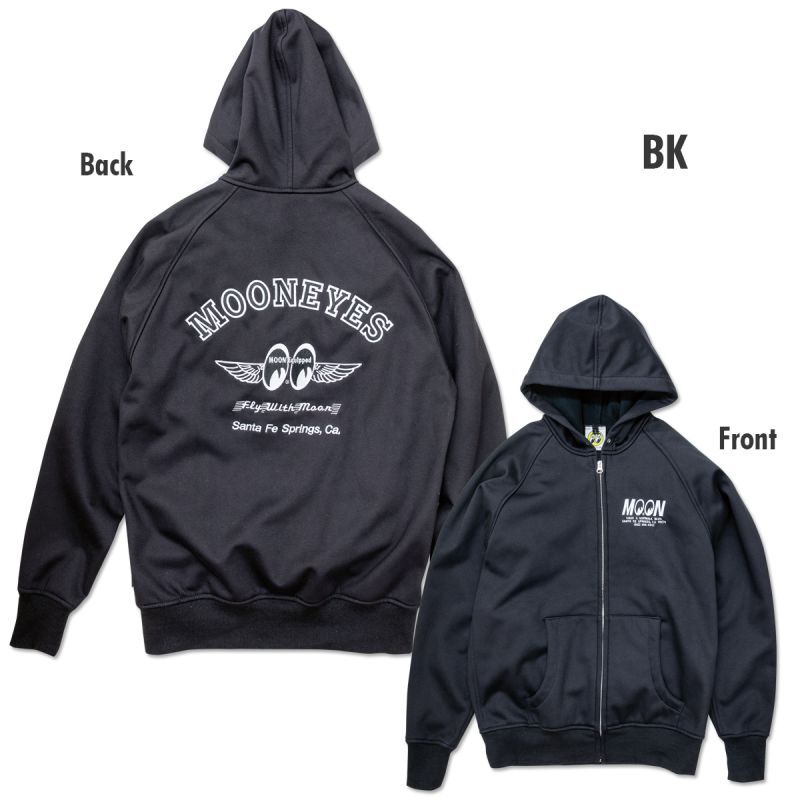 フロントに MOON レタリング ロゴ、バック スタイルは、ウィングが特徴的な Fly with MOON ロゴを刺繍した、防風仕様のフーディーです。