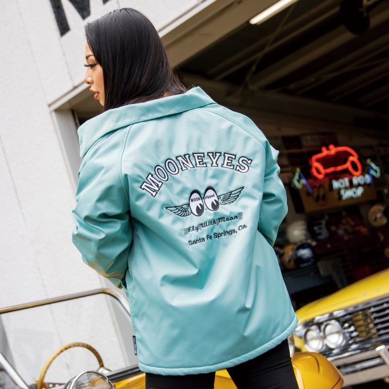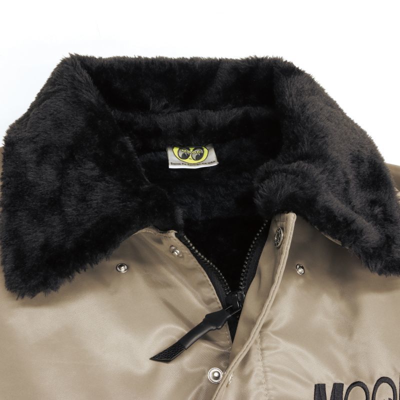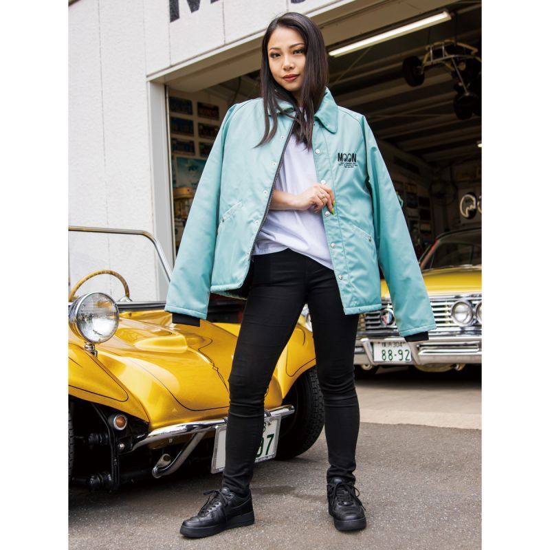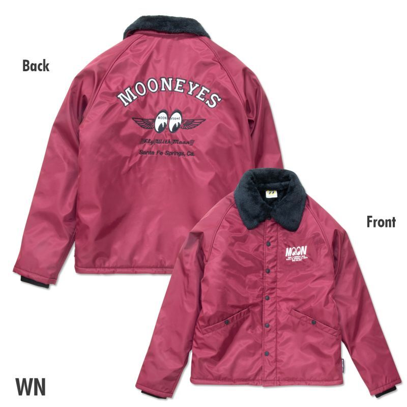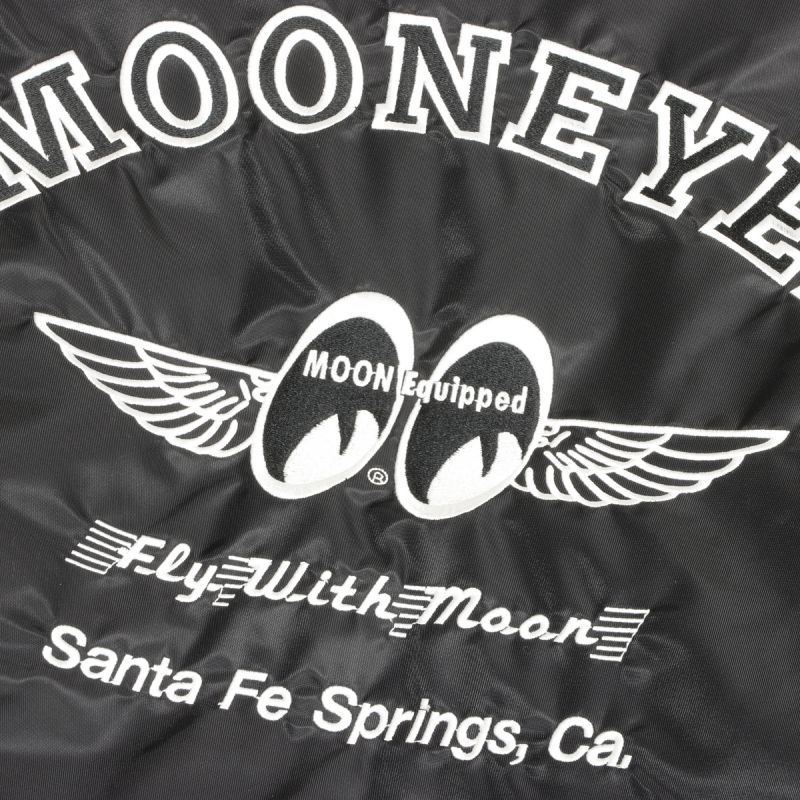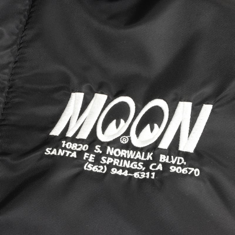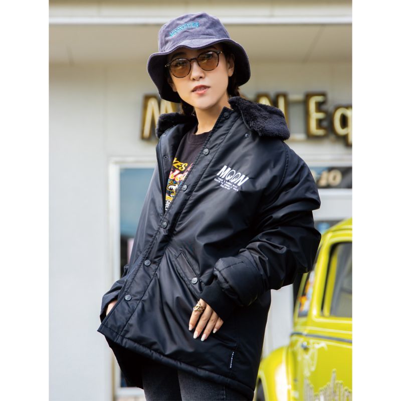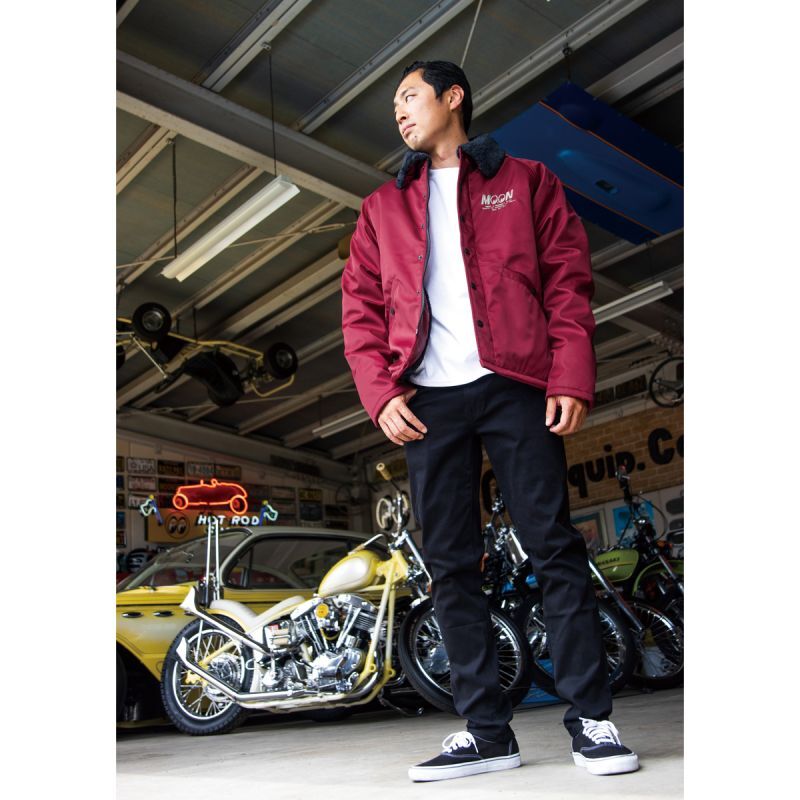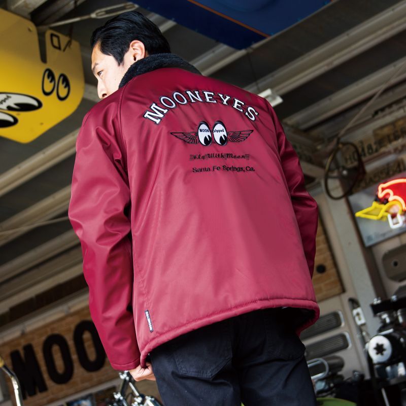 裏地に柔らかなボア素材を使用したボア コーチ ジャケットです。ネック部分にもボアが使用されていて、袖を通した瞬間から暖かさに包まれます。素材は光沢のある ポリエステル生地で、艶のある上品さ見せつつ、風を通しにくく、軽い素材で気軽に羽織れます。フロントはジップの上にバタフライ ボタンが付いた二重構造で、袖もリブ仕様なので、ライディングの際に、防風対策にも優れている本格的なアウターになります。フロントには MOON ロゴ、そしてバックには MOONEYES Fly with MOON とトラディショナルなデザインが刺繍で入ります。ボタンにも MOON ロゴが入っていて、ディテールまでこだわった MOONEYES 仕様です!