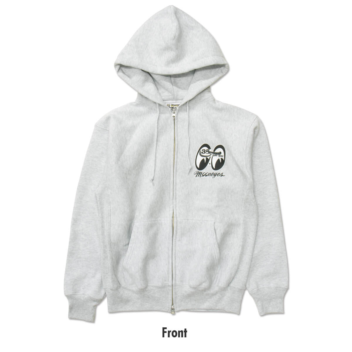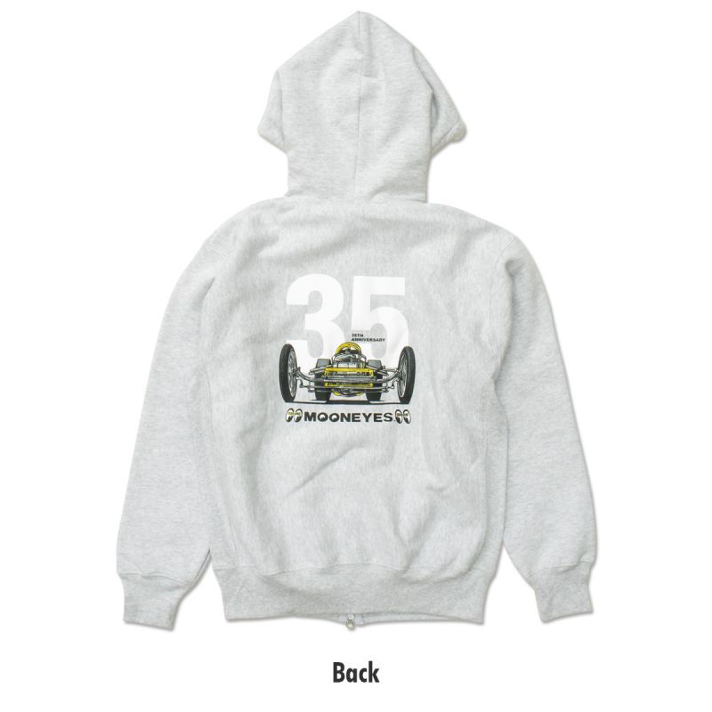 気軽に羽織りやすいダブルスライダーのジップ フーディーで、バックスタイルを飾る大きな 35 と MOONEYES Dragster がインパクト抜群!