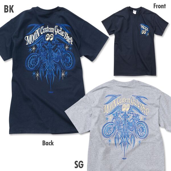 MOON CUSTOM CYCLE SHOP のレタリングと MOON Equipped ロゴを中央にプリント。