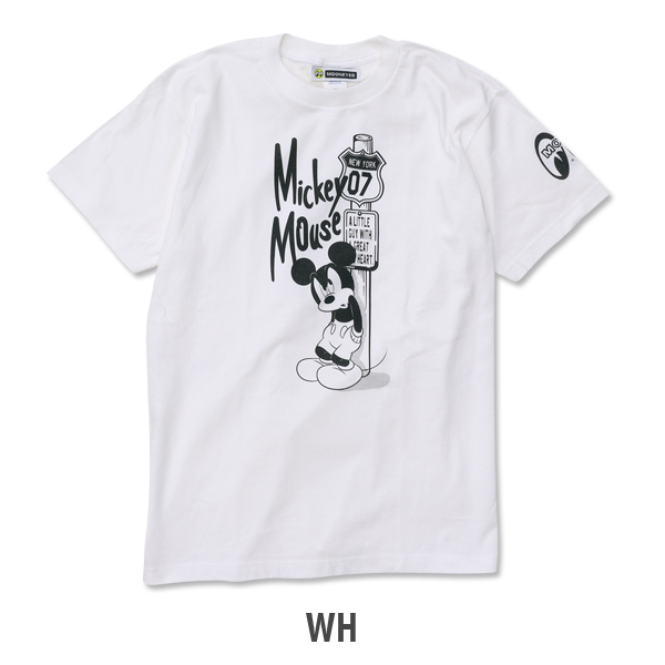 ロードサインの前で、いつもとはちょっと違う、やんちゃな表情をしたミッキーをプリントしたTシャツです。