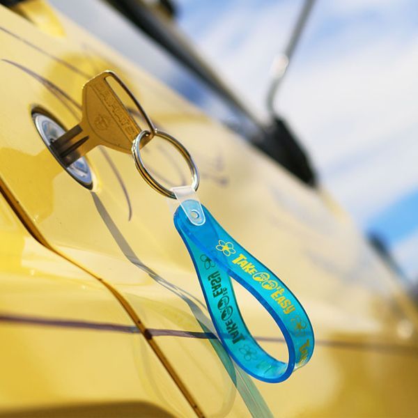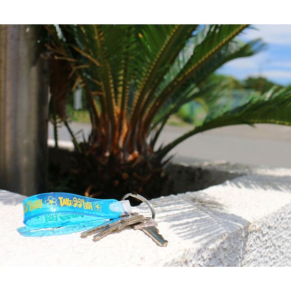 柔らかいビニール素材のベースに、TAKE IT EASY デザインが入った CQQL かつ、夏らしい華やかなキーリング。