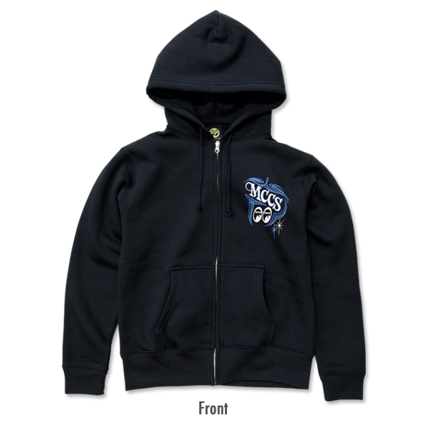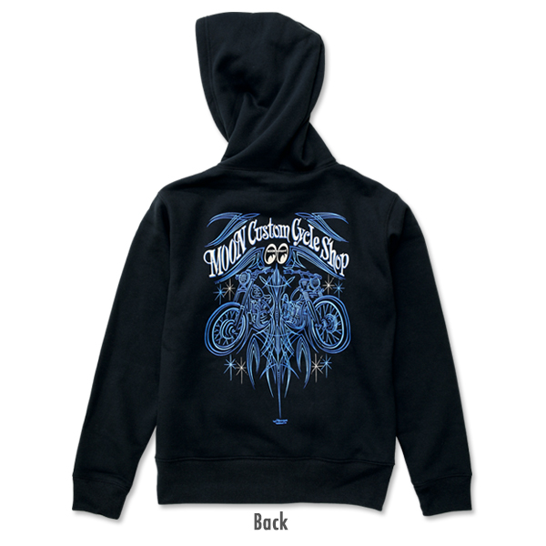 ワイルドマン石井デザインの MOON CUSTOM CYCLE SHOP ジップアップ パーカーです。