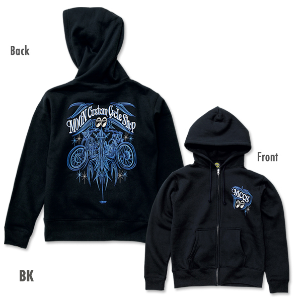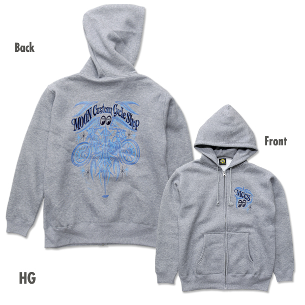 ワイルドマン石井デザインの MOON CUSTOM CYCLE SHOP ジップアップ パーカーです。