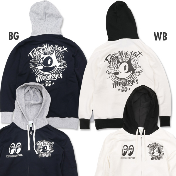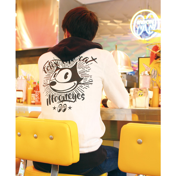 バックには、今までにないフォントで FELIX THE CAT と MQQNEYES ロゴの文字の間にFELIX の FACE を大きくプリントしました。