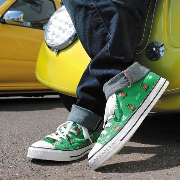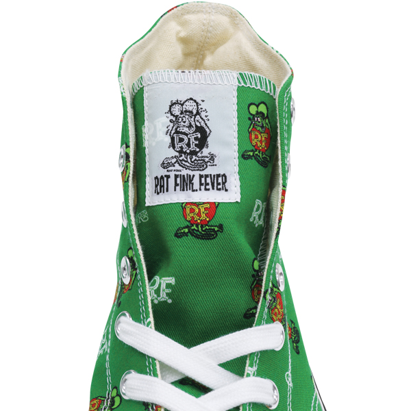 Ed “Big Daddy” Roth ロゴ、スカルフライ、R.F.、スタンディング Rat Fink を散りばめた総柄の Hi-Top シューズです。