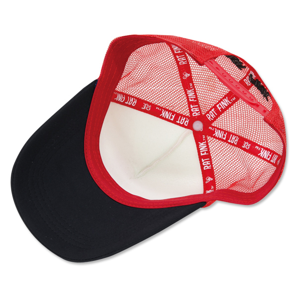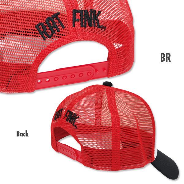 ブラック/ブラックにはホワイト、ネイビー/レッドにはブラックの RAT FINK の文字の刺繍が後ろに施されています。