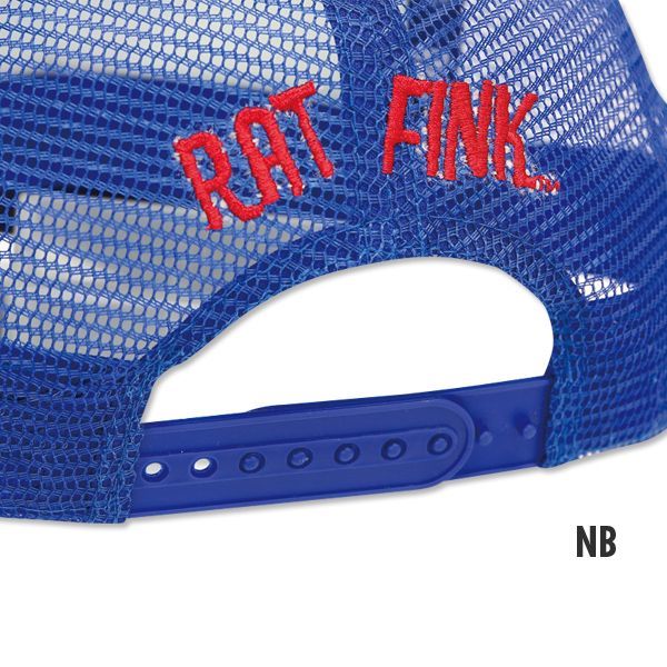 ネイビー/ブルーにはレッド、ブラック/レッドにはブラックのRAT FINK の文字の刺繍が後ろに施されています。