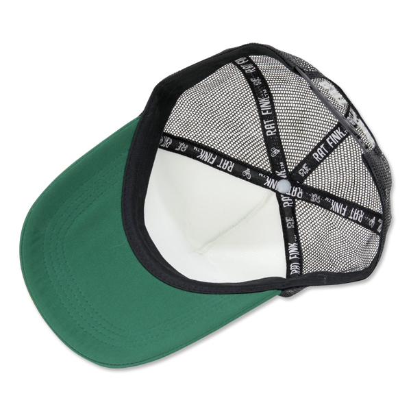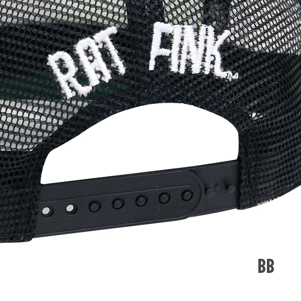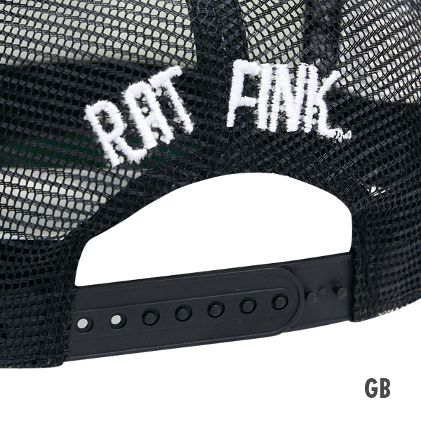 ブラック/グリーンにはブラック、グリーン/ブラックにはホワイトの RAT FINK の文字の刺繍が後ろに施されています。