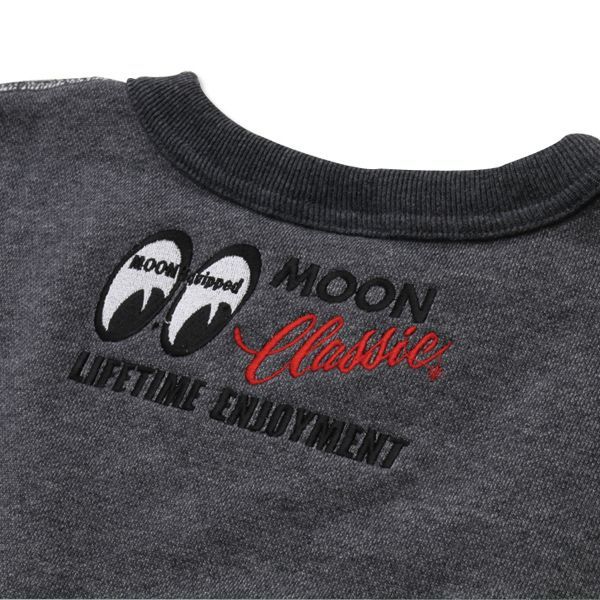 バックは首元に MOON Equipped ロゴ、MOON Classic と LIFE TIME ENJOYMENT のレタリングが刺繍されています。