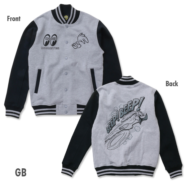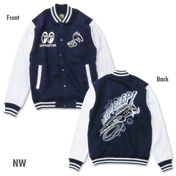 勢いよく駆け抜けていくロード・ランナーがバックに大きくプリントされたスタジアムジャケットです。