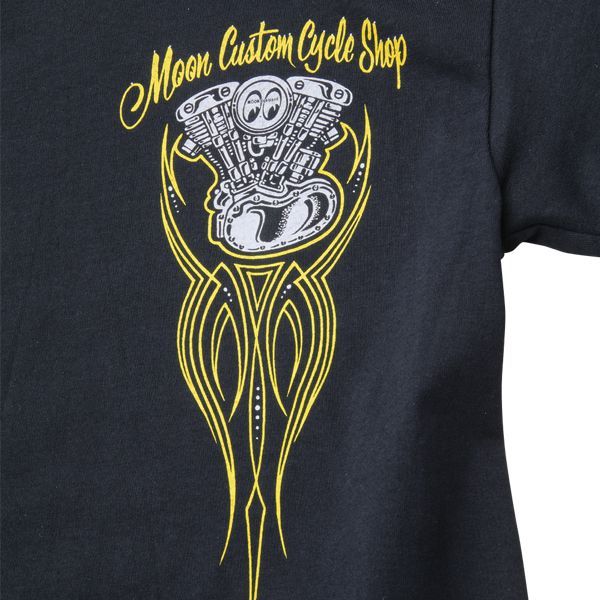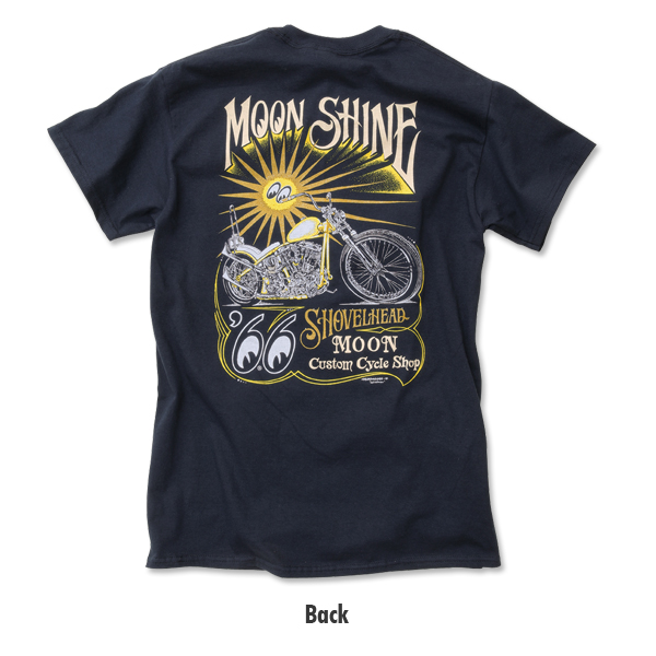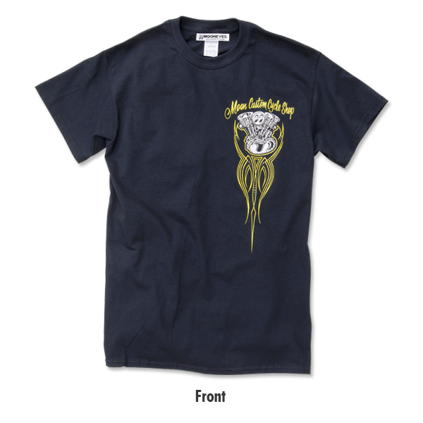 フロントは MOON Custom Cycle Shop のレタリング、そして Shovelhead と アイボール のエアクリーナーが組み合わさったデザインが胸元にワンポイントで入ります。