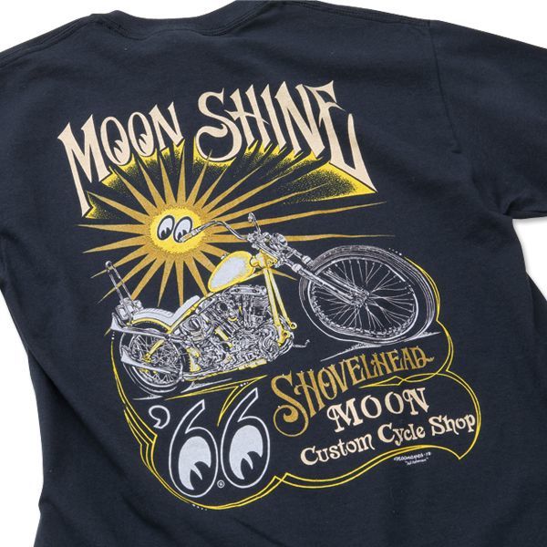 MOONEYES New プロジェクト Motorcycle “MQQN Shine” 1966 Early Shovel がプリントされたTシャツ。