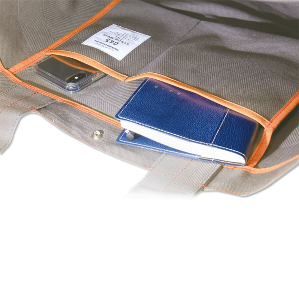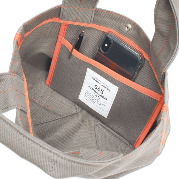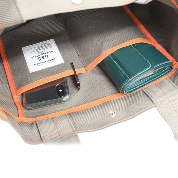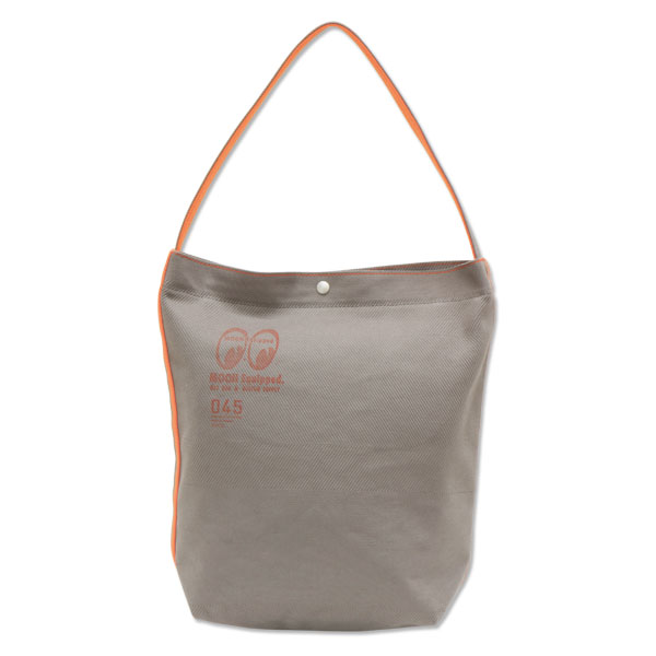 このウォームグレー生地にオレンジ色のバインダーとステッチで横濱帆布鞄の定番モデルのトートバッグです。