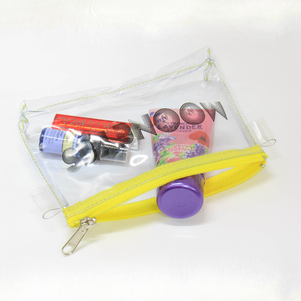 ワンポイントでジッパーと縫い目の色はイエローになっていて、シンプル ビニールポーチなので、汚れもサッと拭き取れて、水辺のおでかけでも多少濡れてもOKです!