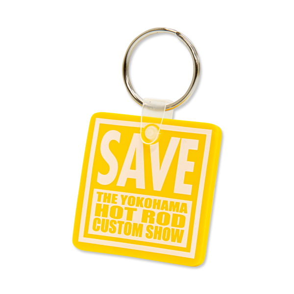 テーマカラーのイエローのベースに、”SAVE THE YOKOHAMA HOT ROD CUSTOM SHOW” ロゴが入ったデザインのキーリングです。