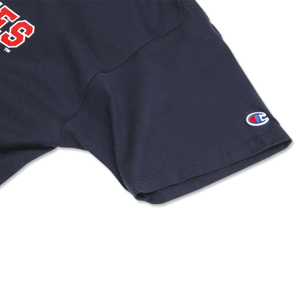 Champion のベースのTシャツなので、袖部分には Champion のロゴが入ります。