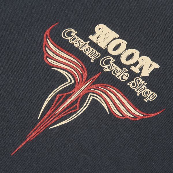 フロントの左胸には MOON Custom Cycle Shop ロゴに、ピンストライプがワンポイントで入っています。