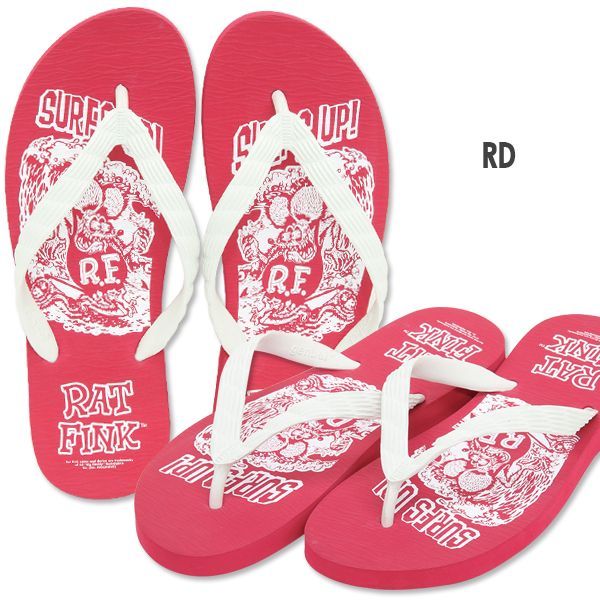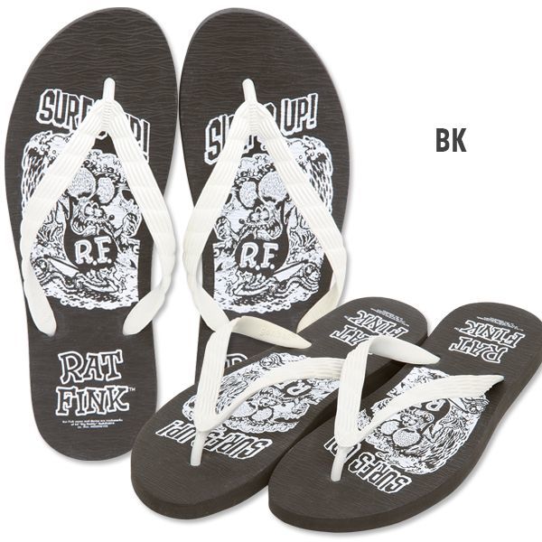 SURFS UP! サーフィンを楽しむ Rat Fink がプリントされたビーチ サンダルです。