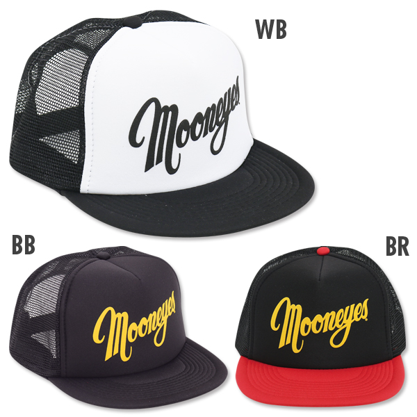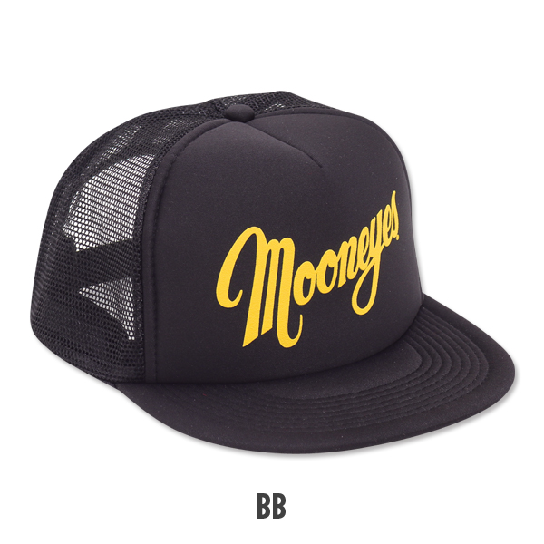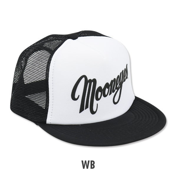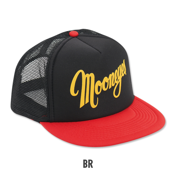 MQQNEYES デザイン ロゴが入った、フラットバイザータイプのトラッカー キャップです。