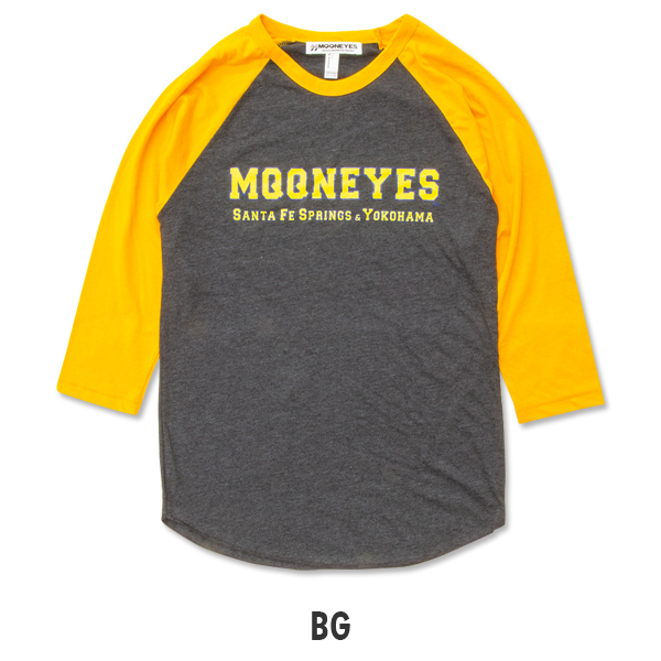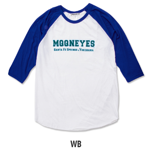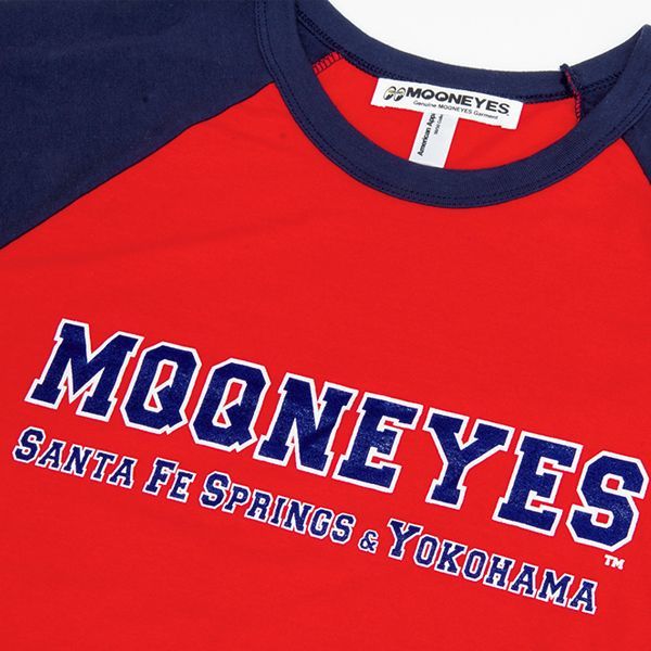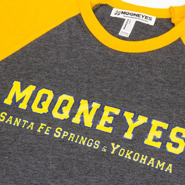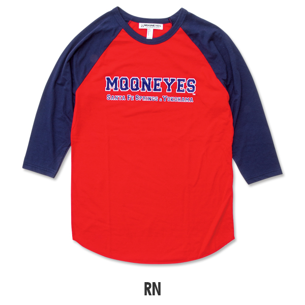 カレッジ スタイルの MQQNEYES ロゴが入ったカラーリング鮮やかなラグラン Tシャツです。