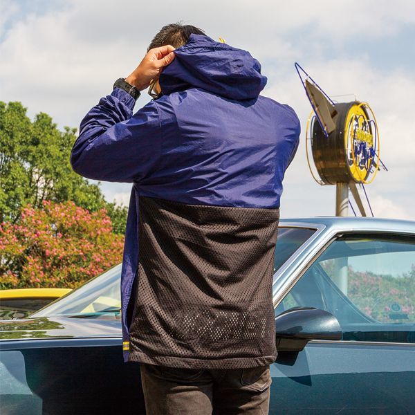 さらに、首元のドロー ストリングでフードを被った際の防風や雨対策にもなります。