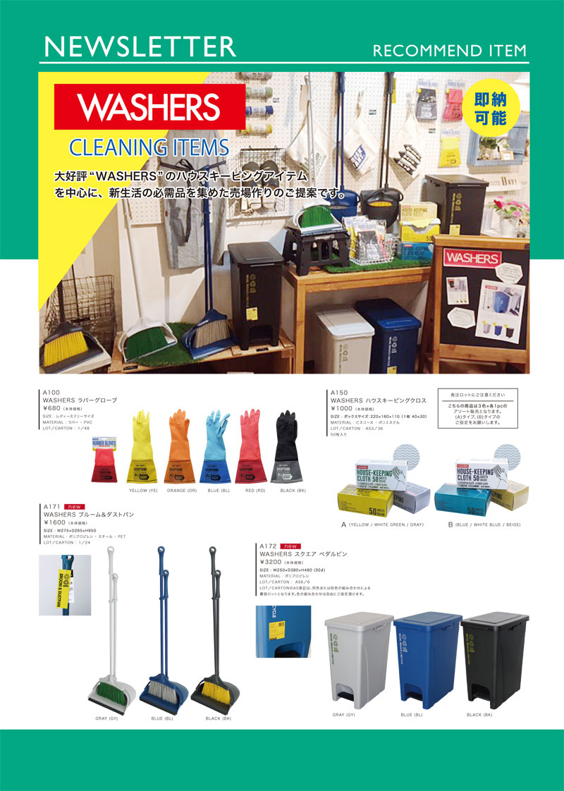 大好評「WASHERS」ハウスキーピングアイテムを中心に、新生活の必需品を集めた売場作りのご提案です。