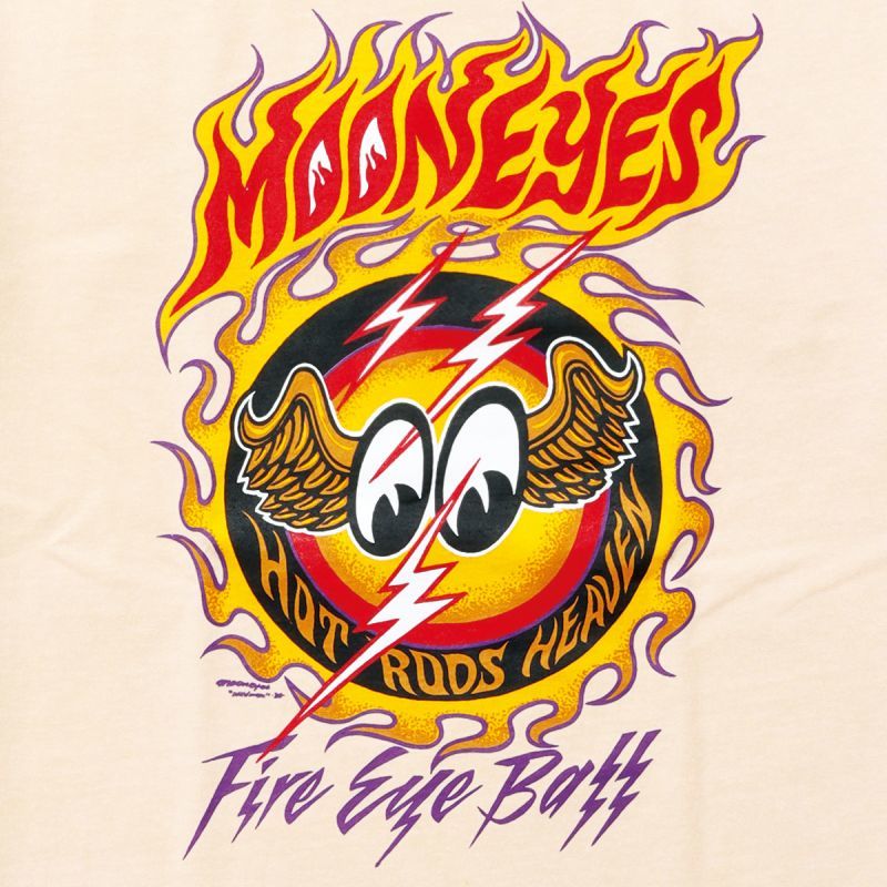 HOT な FIREに囲まれ メラメラと燃える炎のような MOONEYES のレタリングに、Winged Eyeshape、