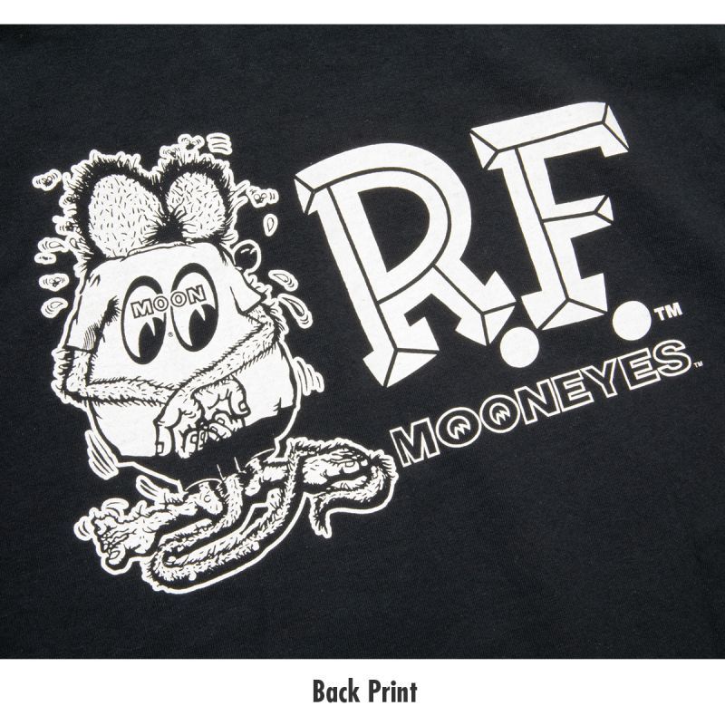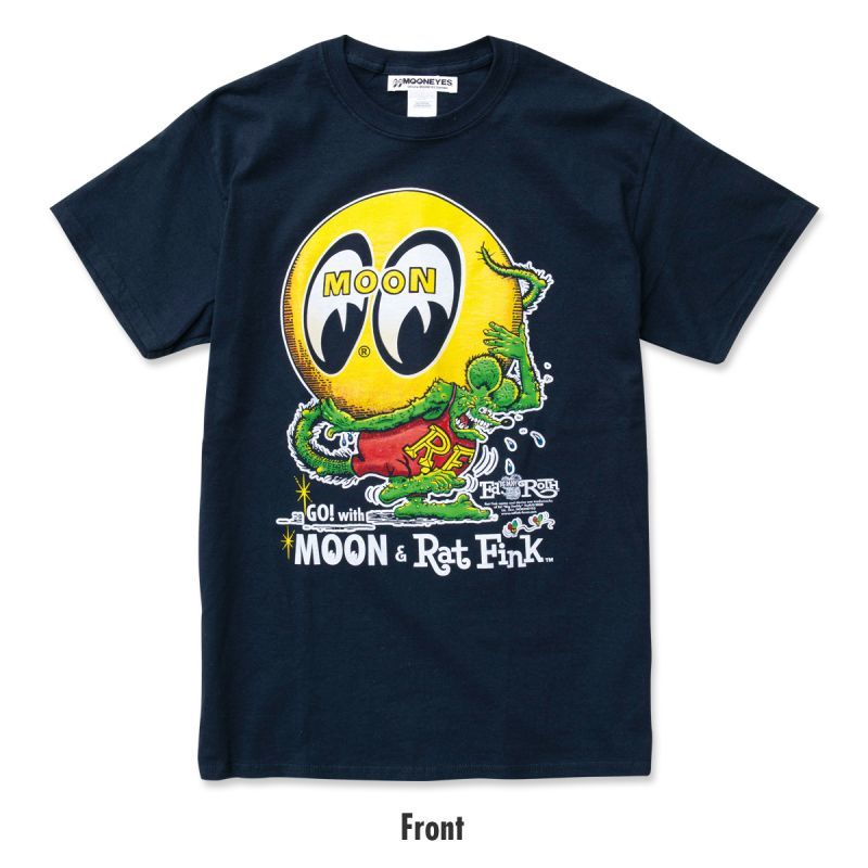 MOONEYES のシンボル マークである大きな MOON アイボールを頑張って抱えている Rat Fink がフロントに大きくフルカラー プリントされていてインパクト大!!