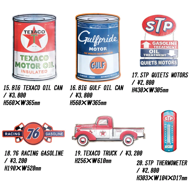 15.BIG TEXACO OIL CAN, 16.BIG GULF OIL CAN, 17.STP QUIETS MOTORS, 18.76 RACING GASOLINE, 19.TEXACOTRUCK, 20.STP THERMOMETER